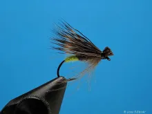 A variation with a small, green ball of rabbit dubbing to create a green butt on the fly imitating the often quite bright eggs that the females deposit. The wing is slightly sparser than on the original, but the fly is essentially tied the same way.