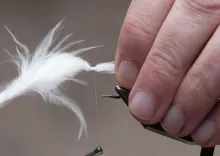 I also tied some flies with a rabbit fur tail. Fine, white rabbit fur has a lot of movement, and is easy to find. It has to be very fine and at least an inch long – preferably longer. Clip off a suitable bunch and hand stack it to even up the tips. Tie it in like your would the marabou, aiming for a large, bushy tail, about a shank length or slightly longer.